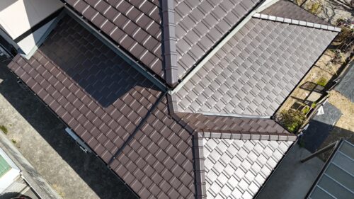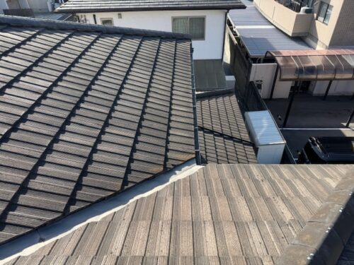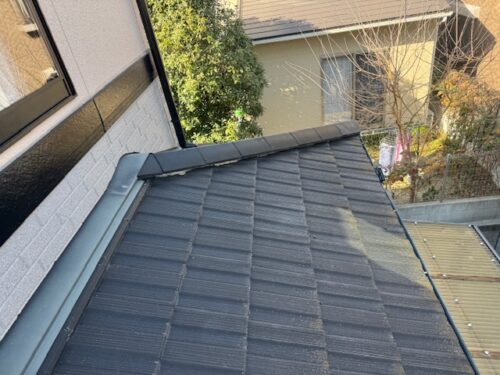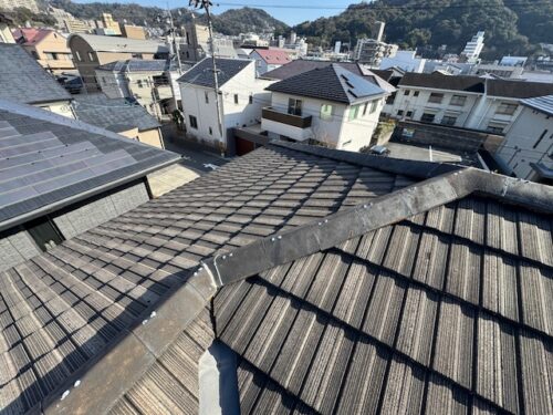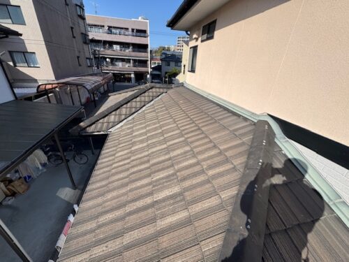 O様邸現地調査の段階では既存屋根材(モニエル平板瓦)の塗膜劣化があり、また棟瓦の釘抜け瓦の脱落などが確認されました。