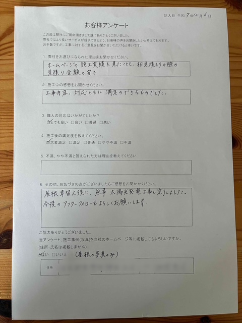 - 最初に見ていただいた時、すぐに悪い箇所を補修していただき(サービスで)とても嬉しく思いました。また工事中も社長さん自ら何度も足を運んでいただき私達は安心してお任せできました。何よりも工事費が他社より良心的で一番助かりました。